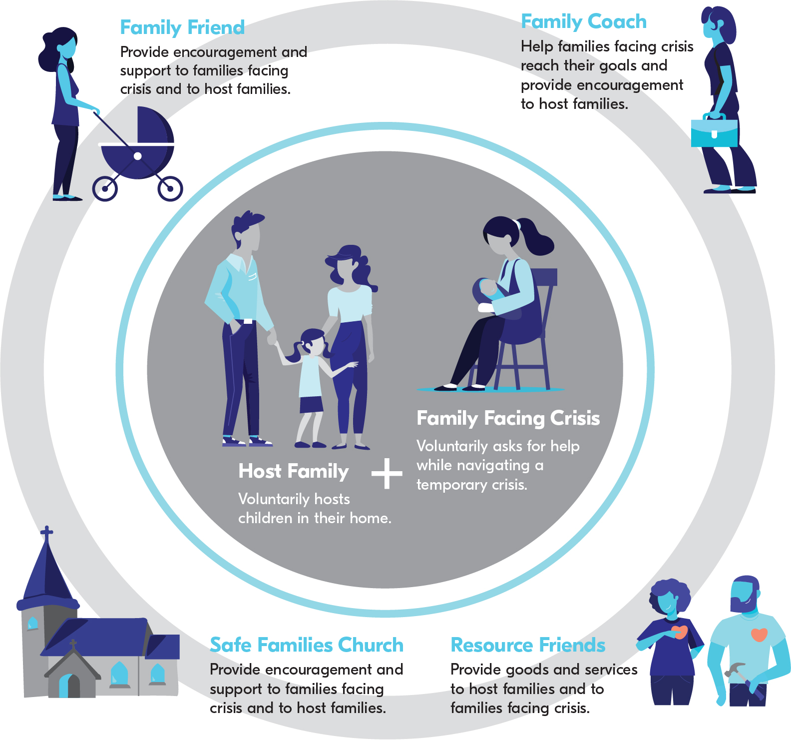 Safe Families reframes how families are supported when facing challenges through a network of volunteers called a Circle of Support, who partner with parents/guardians.