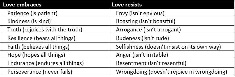 1 Corinthians 13:4–8a (ESV) Love is patient and kind; love does not envy or boast; it is not arrogant or rude. It does not insist on its own way; it is not irritable or resentful; it does not rejoice at wrongdoing, but rejoices with the truth. Love bears all things, believes all things, hopes all things, endures all things. Love never ends.